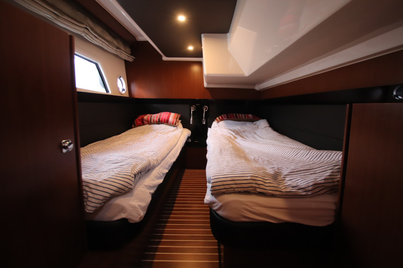 Raumaufteilung mit drei vollwertigen Kabinen und zwei Badezimmern. Die große Flybridge