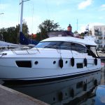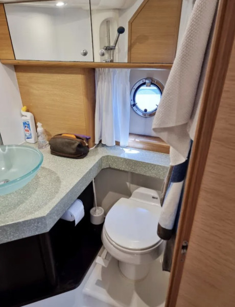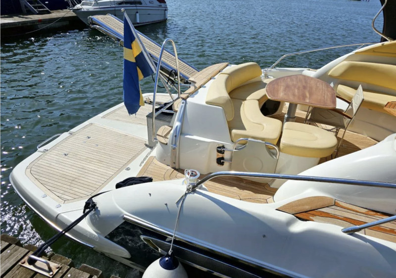 Maintenance: New polishing & waxing of the whole boat, new antifouling (IPS-drives included) with new zincs spring 2024. Latest engine & IPS-drive service with service of the generator included 2023. Previous engine & IPS-drive service winter 2021/2022. Autumn 2020, drive belts, pulleys, belt tensioners were changed and the boat's steering was inspected, serviced & repaired. The generator got a major service and its impeller pump was replaced. Good documentation on the boat's service & maintenance is available and can be shown! Specification: Year: 2007 Country of origin: Italy CE class B (max. 12 persons) Length: 13.80 meters Width: 4.15 meters Depth: 0.90 meters Weight: 11 tons Fuel: 2x550 liters Fresh water tank: 300 liters Septic tank: 150 liters Cabins: 2 Sleeps: 4+2 Seats: 12+6 Toilet/Shower: 2/3 Engine: 2x Volvo Penta IPS-600 Number of hp: 2x435 Running hours: 1000 Operation: Volvo Penta IPS (upgraded) Cooling: Fresh water Cruising speed: 26 knots Maximum speed: 35 knots Fuel consumption: Approx. 3l/nm in march Equipment: Complete cockpit canopy in good condition (color dark blue) Bimini/sun awning with sun protection curtain over rear cockpit Sun- & privacy protection for front & side windows & for sunroof (color black) Electrically opening glass sunroof in the hardtop Wide side decks Opened grab rail with solid handles & bow sprit with recessed bowladder in the bow Teak on foredeck, side deck, swimplatform, steps & in cockpit (good condition) Large sun deck with sun pad on foredeck Hydraulic gangway Bezenzoni with automatically folding railing in the stern - Remote controlled Electrically opening engine compartment hatch LED-illuminated nameplate in the stern Large deep swimplatform with recessed swimladder Shower with hot & cold water by the swimplatform Underwater lighting (color blue) Electric search light - Remote controlled Electric windlass with stainless anchor & chain in the bow - Remote controlled Electric windlass with stainless anchor & lead line in the stern - Remote controlled Electric mooring winches in the stern with foot control Generator Fisher Panda 6.5kW with own battery & battery charger Ctek (approx. 650h) Diesel heater Eberspächer with exhaust in cockpit, salon, cabins & toilets No air conditioning, but the boat is prepared for the installation of air conditioning Water heater Septic tank with discharge overboard & via deck valve Digital level gauge for septic tank Hydraulic steering Hydraulic trim tabs with digital level indicators - Can be operated automatically Joystick control Volvo Penta IPS - Makes the boat incredibly easy to maneuver Electronic controls Volvo Penta EVC Digital engine data/trip computer Volvo Penta (fuel consumption, fuel level, rpm, etc.) Electrically adjustable driver's seat GPS plotter Raymarine E120 with radar GPS plotter Garmin 720 Radar Raymarine Autopilot Garmin (newer model) Tridata Raymarine ST60+ (depth, speed & water temp) VHF radio Raymarine Ray24E with DSC Compass Windscreen wiper Solar panel with regulator (panel not mounted) Digital battery monitoring 220v shore power with earth fault circuit breaker Shore power cable with electric motor for electrical output of the shore power cable 220v outlet 12v socket USB socket for charging mobile phones Powerful battery bank (1 start battery recently changed) Battery charger 50 amp Wet-bar with cold water sink, Isotherm refrigerator, Isotherm ice machine, electric grill, cup holder & storage cupboard in cockpit Stereo Bluetooth/USB with speakers in cockpit & saloon Kitchen with sink with hot & cold water, large fridge & separate Isotherm freezer, 2-plate induction hob, microwave, storage cupboard & storage in salon L-shaped sofa for 4 people with adjustable dining table in lounge - The sofa can be converted into an extra double bed Midcabin with large double bed, extra bed mattress, 2-seater sofa, opening side windows, TV & wardrobe storage Own toilet with vacuum-flush toilet & shower in Midcabin - Entrance to the toilet also from the salon Front cabin with large double bed, extra bed mattress, TV, opening side windows, opening top hatch with blackout curtain & mosquito net & wardrobe storage Bathroom with double entrances (from Guest cabin & from hall) with vacuum-flush toilet & separate shower cubicle Spot lighting LED in the stairs down to the saloon & in the ceiling in the saloon/kitchen & in the cabins 4-seater settee with teak cocktail table (aft) in cockpit Sun bunk on the port side of the driver's seat 4-seater sofa with electrically adjustable teak dining table (forward facing) in cockpit - The sofa can be converted into a large sunbed alt. extra sleeping places for 2 people Fire extinguisher Fender holder Fenders & mooring lines E.t.c.