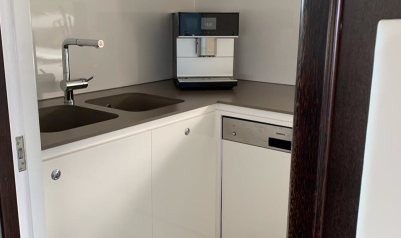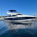 With an overall length of 21.70 m and a beam of 5.66 m, this yacht offers exceptional space for comfortable cruising, onboard living, and stylish entertaining. The GRP semi-displacement hull combines stable performance with timeless elegance.