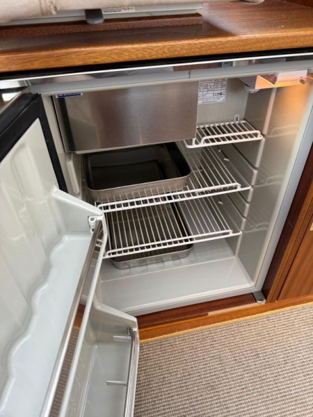 Refrigerator drawer from Waeco and the longitudinal sofa in the saloon 2-burner gas ceramic hob