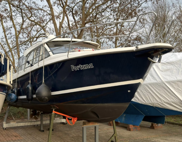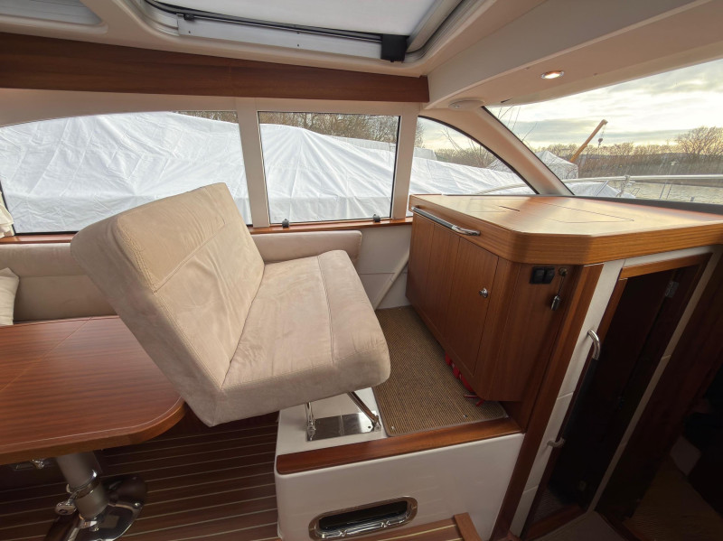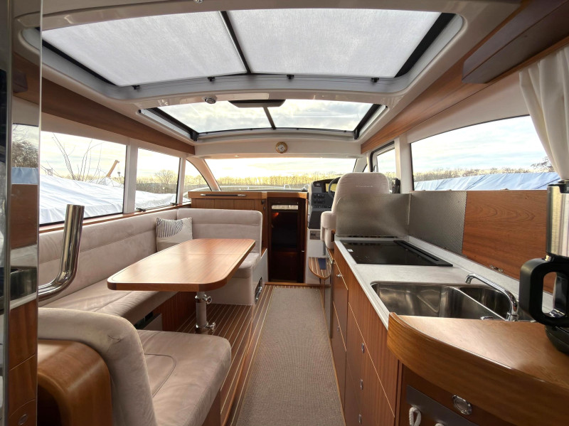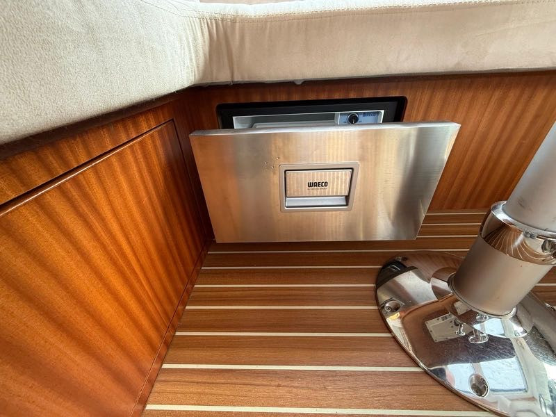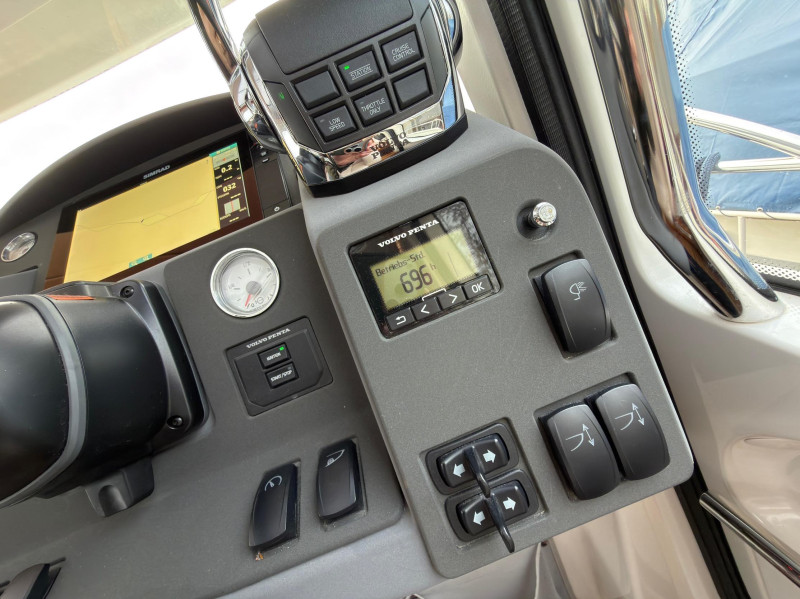Sidepower SE 60 bow and stern thrusters, electric anchor winch with chain and anchor, railing passage, hydraulic trim tabs, searchlight with remote control, 220V shore power connection with Mastervolt charger and Mase Combi 2200 Watt inverter, eight batteries, LED lighting throughout the vessel and dimmer in the saloon Volvo Penta Trimcomputer, Volvo Penta engine data networking, echo sounder and log, TV with satellite antenna in the owner\\\'s cabin, Retractable television in the lounge DVD/DVBT and antenna, Bluetooth connection, digital radio via satellite antenna, , electrically lowerable saloon table with intermediate cushion, electric sunroof with sun blinds, Eberspächer hot air heating with defroster for windscreen, hot water system via engine + 220 volts, galley with gas cooker, 12/220 V refrigerator, Refrigerator drawer from Waeco and the longitudinal sofa in the saloon spacious bathroom with separate shower, electric WC, waste tank with electric emptying and deck suction, stern shower, hot/cold,