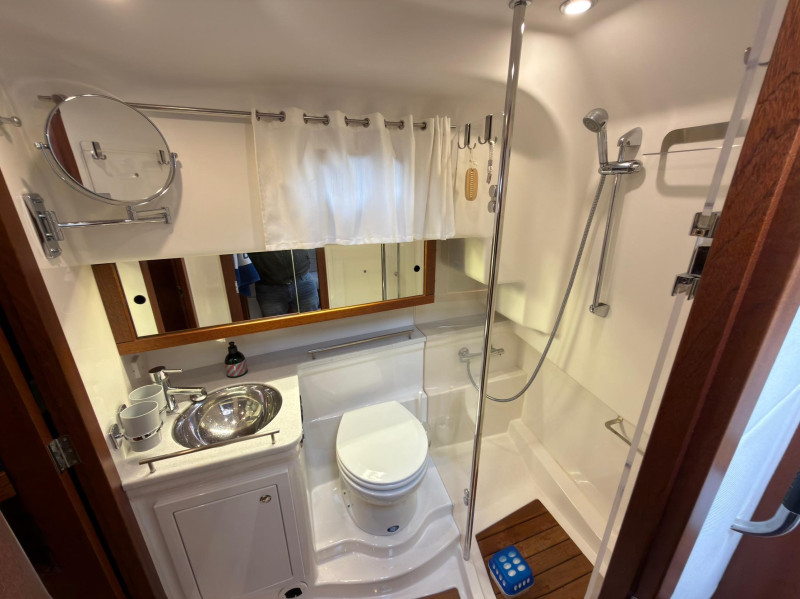 spacious bathroom with separate shower, electric toilet, waste tank with electric emptying