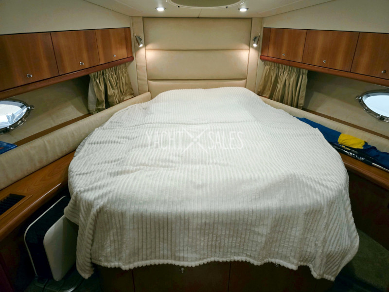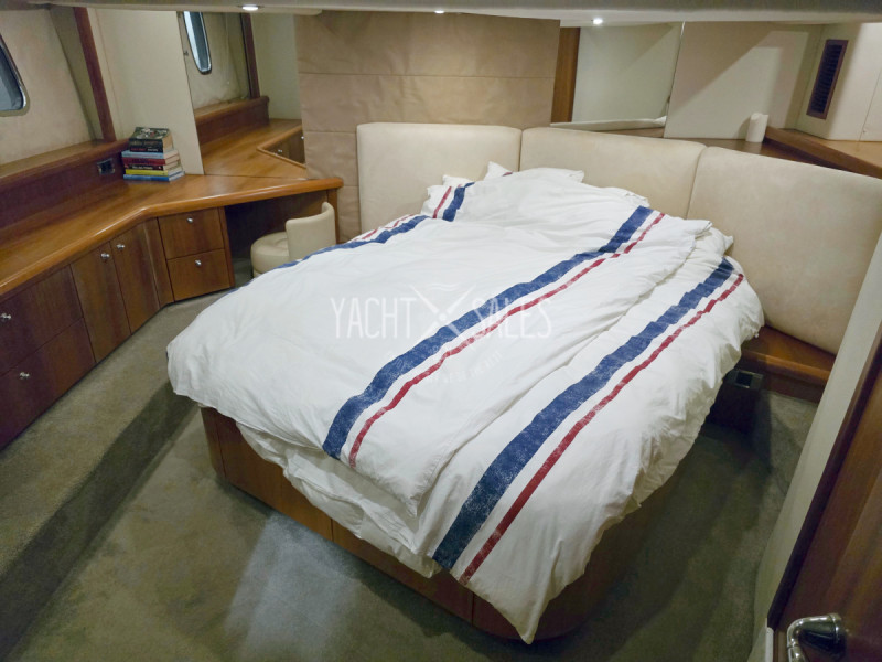 Large full-width Master cabin amidships with king-size double bed with extra mattress, storage space under the bed & drawers in the headboard, TV, large express side windows (5 of which 2 can be opened), blackout blinds, large wardrobe with mirror, large chest of drawers with large shelving area, vanity desk/desk & stool etc.