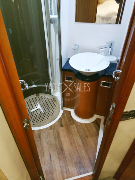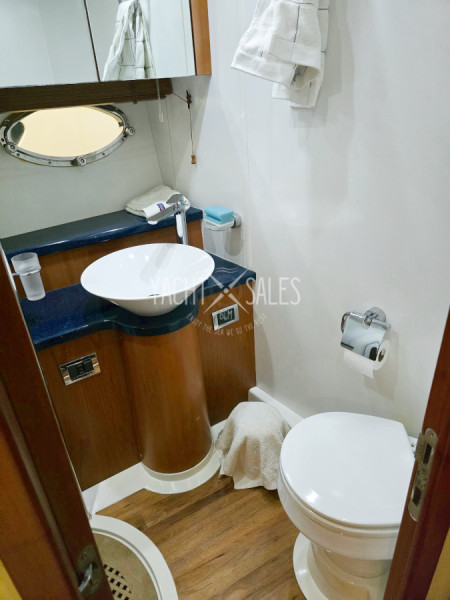 Private bathroom to Master cabin with vacuum flush toilet, separate shower cabin, mirror cabinet & openable hull vent with blackout blind etc.